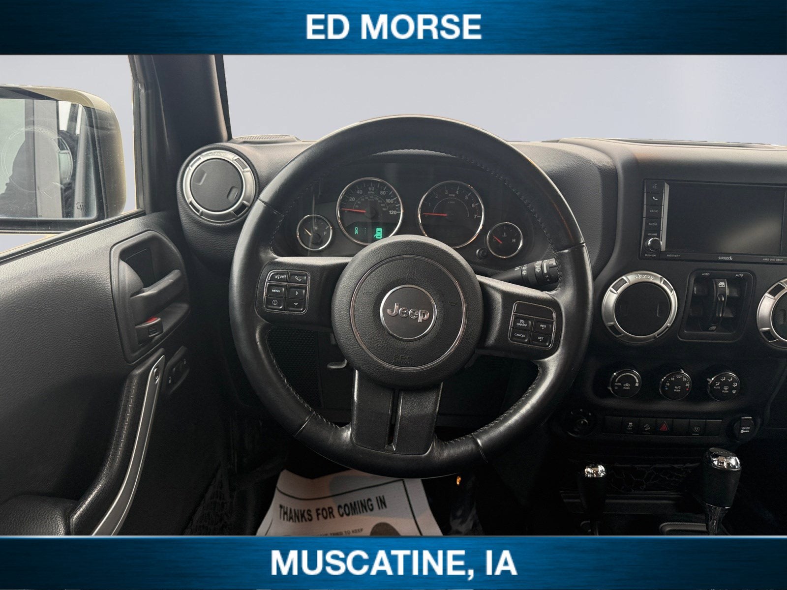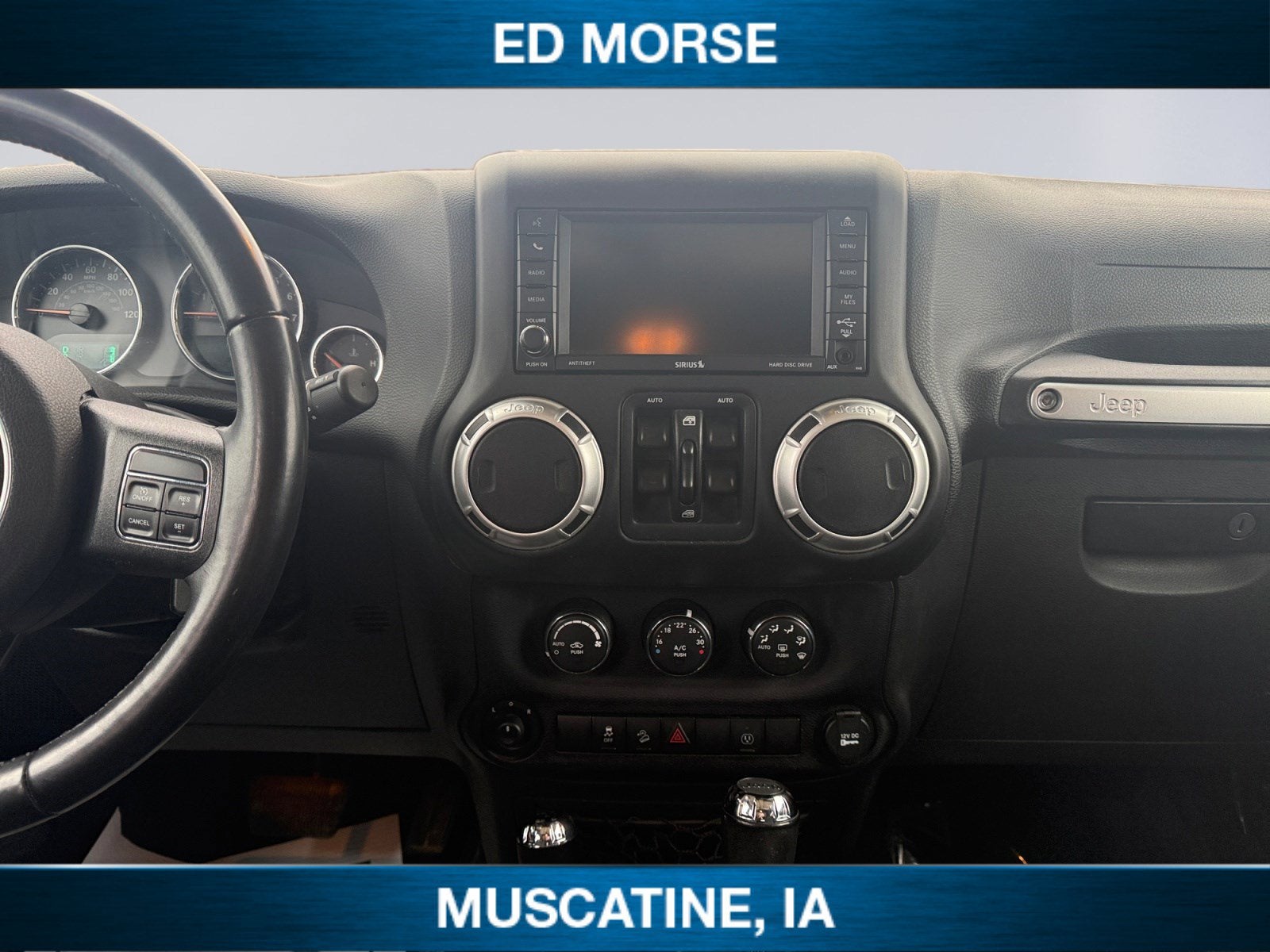 Equipped with Connectivity Group (Remote USB Port, Tire Pressure Monitoring Display, Uconnect Voice Command w/Bluetooth®, and Vehicle Information Center), Dual Top Group (Black 3-Piece Hard Top, Delete Sunrider Soft Top, Freedom Panel Storage Bag, Premium Black Sunrider Soft Top, Rear Window Defroster, and Rear Window Wiper/Washer), Quick Order Package 24G (Body Color Appliques Front Bumper, Body Color Appliques Rear Bumper, and Body Color/Accent Color Grille), Trailer Tow Group (Class II Receiver Hitch and Trailer Tow w/4-Pin Connector Wiring), GPS Navigation, 18 x 7.5 Polished Satin Carbon Wheels, 3.21 Rear Axle Ratio, 4-Wheel Disc Brakes, 40GB Hard Drive w/28GB Available, 5-Year SiriusXM Travel Link Service, 6.5 Touchscreen Display, 8 Speakers, ABS brakes, Air Conditioning, Air Conditioning w/Auto Temperature Control, Alloy wheels, AM/FM radio: SiriusXM, Audio Jack Input for Mobile Devices, Auto-dimming Rear-View mirror, Brake assist, CD player, Cloth Seats w/Adjustable Head Restraints, Compass, Driver door bin, Driver vanity mirror, Dual front impact airbags, Electronic Stability Control, Front anti-roll bar, Front Bucket Seats, Front Center Armrest w/Storage, Front fog lights, Front reading lights, Fully automatic headlights, Heated door mirrors, Heavy Duty Suspension w/Gas Shocks (DISC), Humidity Sensor, Illuminated entry, Integrated roll-over protection, Leather steering wheel, Low tire pressure warning, Occupant sensing airbag, Outside temperature display, Panic alarm, Passenger door bin, Passenger vanity mirror, Power door mirrors, Power steering, Power windows, Radio data system, Radio: 130, Radio: 430 Nav, Radio: 430N (DISC), Rear anti-roll bar, Remote keyless entry, Remote Start System, Security system, SiriusXM Travel Link, Speed control, Split folding rear seat, Steering wheel mounted audio controls, Tachometer, Tilt steering wheel, Traction control, Trip computer, and Variably intermittent wipers.