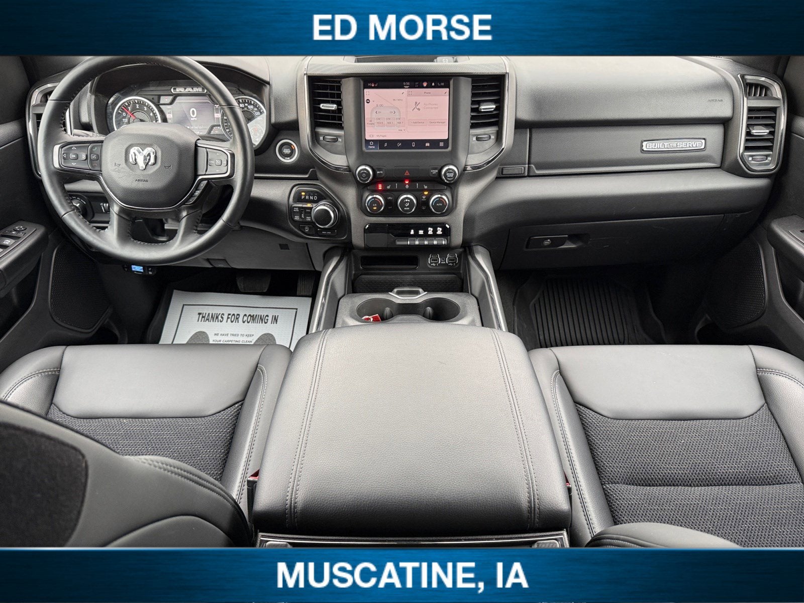 Equipped with Big Horn Level 2 Equipment Group (DISC) (115V Auxiliary Power Outlet, 2nd Row In Floor Storage Bins, 400W Inverter, 4G LTE Wi-Fi Hot Spot, 8.4 Touchscreen Display, 9 Amplified Speakers w/Subwoofer, Air Conditioning ATC w/Dual Zone Control, Apple CarPlay, Auto-Dimming Exterior Driver Mirror, Auto-Dimming Rear-View Mirror, Black Exterior Mirrors, Black Premium Power Mirrors, Bluetooth® Handsfree Phone & Audio, Class IV Receiver Hitch, Cluster 7.0 TFT Color Display, Connectivity - US/Canada, Convex Wide-Angle Exterior Mirror Insert, Electric Shift-On-Demand Transfer Case, Exterior Mirrors Courtesy Lamps, Exterior Mirrors w/Heating Element, Exterior Mirrors w/Supplemental Signals, For Details, Visit DriveUconnect.com, For More Info, Call 800-643-2112, Front Fog Lamps, Glove Box Lamp, Google Android Auto, GPS Antenna Input, Heated Front Seats, Heated Steering Wheel, Integrated Center Stack Radio, LED Footwell Lighting, Media Hub w/2 Charge Only USBs, ParkSense Front/Rear Park Assist w/Stop, Power 2-Way Driver Lumbar Adjust, Power 8-Way Driver Seat, Power Adjustable Pedals, Power-Folding Mirrors, Radio: Uconnect 5 W w/8.4 Display, Rear Dome w/On/Off Switch Lamp, Rear Power Sliding Window, Rear Window Defroster, Remote Start System, Security Alarm, SiriusXM Satellite Radio, Sun Visors w/Illuminated Vanity Mirrors, Universal Garage Door Opener, and USB Host Flip), Quick Order Package 27Z Big Horn (Big Horn Badge), 3 Rear Seat Head Restraints, 3.21 Rear Axle Ratio, 4 Way Front Headrests, 4-Wheel Disc Brakes, 48V Belt Starter Generator, 6 Speakers, ABS brakes, Air Conditioning, Alloy wheels, AM/FM radio, Brake assist, Bumpers: chrome, Cloth Bench Seat, Compass, Delay-off headlights, Driver door bin, Dual front impact airbags, Dual front side impact airbags, E-Locker Rear Axle, Electronic Stability Control, Emergency communication system: SiriusXM Guardian, Front anti-roll bar, Front Center Armrest w/Storage, Front License Plate Bracket, Front reading lights, Front Seat Back Map Pockets, Front wheel independent suspension, Fully automatic headlights, Global Telematics Box Module (TBM), Heated door mirrors, Illuminated entry, Integrated Voice Command w/Bluetooth®, Leather steering wheel, Low tire pressure warning, Mopar Black Tubular Side Steps, MOPAR Front & Rear Rubber Floor Mats, Occupant sensing airbag, Outside temperature display, Overhead airbag, Overhead console, Panic alarm, ParkView Rear Back-Up Camera, Passenger door bin, Passenger vanity mirror, Power door mirrors, Power steering, Power windows, Radio data system, Radio: Uconnect 3 w/5 Display, RAM Grille Badge - Chrome, Rear 60/40 Folding Seat, Rear anti-roll bar, Rear seat center armrest, Rear step bumper, Remote keyless entry, Speed control, Split folding rear seat, Steering wheel mounted audio controls, Tachometer, Telescoping steering wheel, Tilt steer